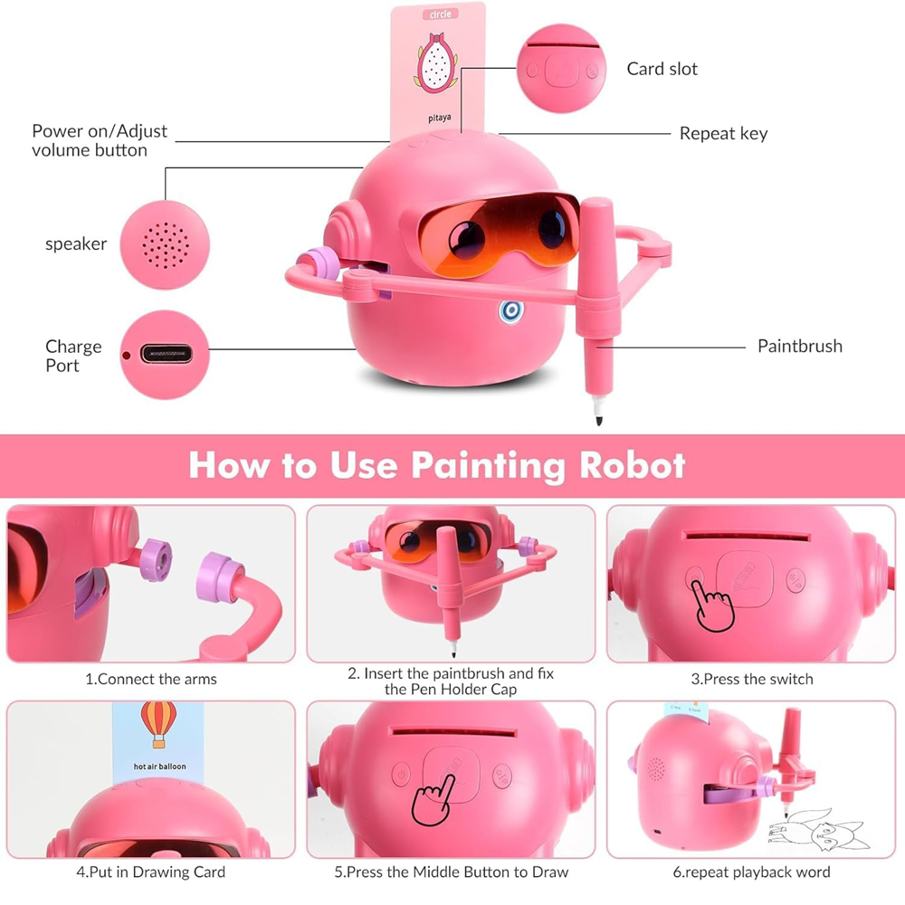 • Educational smart drawing robot with extendable arms that automatically sketches preset images when the matching card is inserted — effortless creativity for young artists.